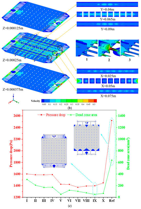 Figure 7c presents the inlet and outlet pressure drop and dead-zone area. A comparison of channel structures I, II, III, and IV showed that the deflection angle of the flow channel, on both sides of the inlet and outlet, had almost no effect on the pressure drop at the inlet and outlet. However, it had a certain effect on the elimination of the flow dead-zone area. Further, a comparison of the V, VI, VII, VIII, IX, X, and Reference channel structures showed that the addition of a secondary branch channel at the inlet and outlet will have a certain impact on the pressure drop at the inlet and outlet. Regarding the reaction zone, the extent of the flow dead zone exhibited greater sensitivity. Specifically, its size decreased progressively with the addition of secondary branch channels at the inlet/outlet. Among the configurations evaluated, flow channel IX demonstrated the most effective reduction in stagnant regions within the reaction zone, achieving a minimal dead-zone area of 0.507% alongside inlet/outlet pressures of 1397.46 Pa.