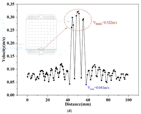 Figure 7d presents the velocity distribution of channel structure IX at 0.017 mm (inlet side), which was used to more thoroughly analyze the velocity distribution of the optimized structure. Compared with the Reference channel structure presented in Section 3.1, the jet velocity of the secondary branch channel on the inlet side was significantly improved. The maximum jet velocity decreased by 45.4%, the minimum jet velocity increased by 720%, and the range of the velocity distribution on the characteristic line decreased by 51.97%. The reason for these findings is that the fluid in the Reference channel structure was strongly geometrically variable when flowing from the single inlet into the reaction zone, and from the fluid jets to the reaction zone through the secondary branch channel, which easily produced a flow dead zone. However, the addition of a secondary branch channel at the corresponding flow dead zone increased the jet flow path, improved the fluid mass transfer capacity of the original dead zone, and then increased the flow rate in this zone. However, incorporating secondary branch channels diminished the fluid momentum within the inlet branches, consequently lowering the inlet velocity. This dead-zone compensation strategy thus offers considerable utility in enhancing flow field uniformity for aqueous AgO-Al batteries.