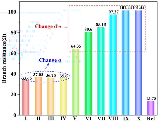 Figure 8 presents the branch resistance of different channel types. It can be clearly seen that the branch resistance of the Reference channel was the smallest (13.75 Ω), and the branch resistances of channels IX and X were the largest (both were 101.44 Ω). Compared with the traditional Reference channel, the branch resistance of each channel type after optimization was improved by varying degrees, and the maximum increase was up to 637.8%. From the perspective of the increase in branch resistance, the deflection angle α of the flow channel had a small effect on the branch resistance, but the width and number of the flow channels had a large effect on the branch resistance and showed a significant linear growth relationship. The reason was that the branch resistance of the flow channel was largely affected by its length, cross-sectional area, and material. Furthermore, the difference between the first four types of flow channels (I, II, III, and IV) was the deflection angles on both sides of the bipolar plate, which were 50°, 55°, and 60°, respectively. However, due to the limitation of the first-order branch channel and the edge of the reaction zone, it was obvious that the change in the deflection angle of the flow channel had a small effect on its length and cross-sectional area. This led to a small difference in the branch resistance of the first four types of flow channels (I, II, III, and IV). Further, this corresponded to the mathematical relationship (Equation (4)) of the parameters in the calculations of the branch resistance. Notably, the branch resistance of the latter six channels (V, VI, VII, VIII, IX, and X) increased linearly. However, there was a critical value, which appeared in channel IX. It could then be concluded that the branch resistance of the flow channel did not always increase linearly under the given conditions. In addition, there was a critical value for a certain state, which provides significant guidance for the design of a flow channel for an aqueous AgO-Al battery in the future.