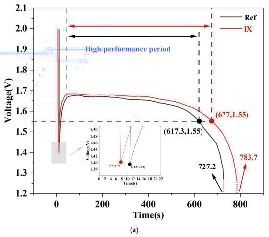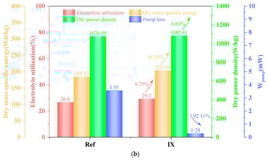 According to the computational analysis, channel IX was a promising candidate for the dead-zone-compensated design. To fully confirm the effect of the novel flow field design, the two comparative channels (Ref and IX) were engraved onto the bipolar plate as aqueous AgO-Al battery flow fields. Subsequently, the battery cell was assembled, and the discharge performance was tested using the battery test system presented in Section 3.1. Figure 9 shows the discharge performance of the aqueous AgO-Al battery for the flow channels Ref and IX. The discharge voltage curves of the two flow channels were basically the same for a current density of 600 mA/cm2 (Figure 9a). Analysis revealed a superior discharge performance for channel IX during the high-current/peak operational phase. Compared with the Ref channel, the discharge time of channel IX was longer in the high-performance period (Ref: 617.3 s and IX: 677 s), and the discharge time was prolonged by 9.67%. Additionally, key performance metrics—activation latency, mean discharge voltage during the high-current phase, and discharge duration—were quantified for both flow channel configurations: Ref (10.8 s, 1.65 V, and 727.2 s, respectively) and IX (7.6 s, 1.66 V, and 783.7 s, respectively). Flow channel IX demonstrated significant performance enhancements: a 3.2 s reduction in activation latency, a 0.61% increase in mean discharge voltage, and a 7.77% extension in discharge duration. As can be seen in Figure 9b, the EU, EM, and WM values of the optimized flow channel IX were improved by varying degrees, and Wpump was lower. The EU, EM, and WM values for the two flow channels were as follows: Ref (26.6%, 184.52 Wh/kg, 1076.09 W/kg, and 0.504 W/cm2, respectively) and IX (29.2%, 203.59 Wh/kg, 1082.61 W/kg, and 0.28 W/cm2, respectively). Compared with the Reference flow channel, the EU, EM, and WM values of flow channel IX increased by 9.77%, 10.35%, and 0.61%, respectively, and Wpump decreased by 44.44%. Further, flow channel IX increased the EU by 29.2% at a current density of 600 mA/cm2. Compared with the work by Pan et al. [], the EU was further improved. Moreover, the obtained specific capacity is 7.05% higher than the value of 381.3 mAh/g at a current density of 650 mA/cm2 as previously reported by He et al. []. In light of the discussions presented above, the proposed DZC design can be regarded as a general method for the flow field optimization of aqueous AgO-Al batteries.