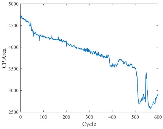 where i is the data point index, is the CP value of the ith data point, and [a,b] is the integration interval. Figure 2 illustrates the variation in the CP integral area throughout the cycle of a single battery under laboratory conditions.