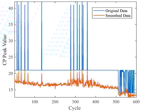 where Q represents the battery capacity and P denotes the battery power. Figure 3 illustrates the variation in the peak CP curve throughout the cycle of a single battery under laboratory conditions. The blue curve depicts the measured data, while the orange curve represents the Gaussian-filtered result.