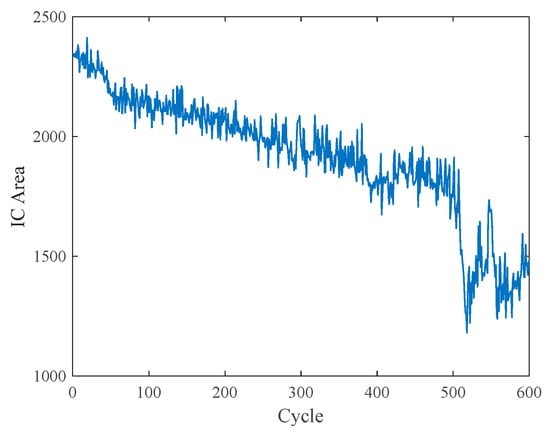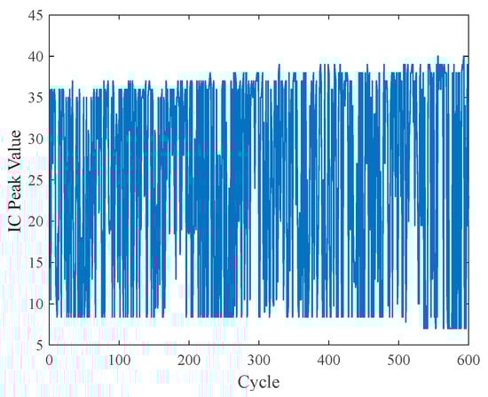 where Q represents the battery capacity, V represents the battery voltage, and a and b are the integral intervals for selecting the voltage. Figure 5 and Figure 6 show the changes in the integral area and peak value of IC for a single battery throughout the entire cycling process under laboratory conditions. Figure 5 presents the variation in IC integral area throughout the cycle of a single battery under laboratory conditions, while Figure 6 demonstrates the corresponding changes in IC peak values.