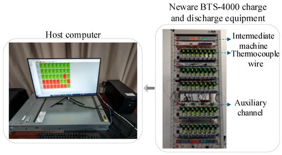 Through the high-performance battery testing system established in the laboratory, we conducted aging experiments on lithium-ion batteries at room temperature and collected relevant aging data. The high-performance battery testing system comprises the Neware BTS-4000 (NEWARE, Shenzhen, China) single battery testing equipment and a host computer. The single battery testing equipment, renowned for its high responsiveness, precision, and efficiency, supports constant current, constant voltage, and combined constant current and constant voltage test modes. It is capable of performing cycle life and pulse power tests. The host computer is used to set test parameters and to collect and store data. The experimental setup is illustrated in Figure 11.