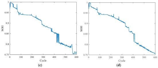The lithium-ion battery SOH deterioration trend for (a) Battery 1, (b) Battery 2, (c) Battery 3, and (d) Battery 4.