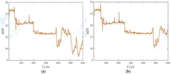 The lithium battery capacity recovery phenomenon refers to the temporary increase in capacity that occurs during the cycling or standing process of the battery. Its essence stems from the brief restoration of the reversible degradation mechanism within the battery. In this study, batteries 1–4 were tested using charging rates of 0.2 C, 0.3 C, 0.4 C, and 0.6 C, respectively. Due to the differences in charging rates, the charging time of batteries 1 and 2 was significantly longer than that of batteries 3 and 4, and they experienced a longer operating time under the same number of cycles. When the environmental temperature experienced seasonal cooling to 10 degrees Celsius and then warmed up, this temperature recovery had a significant activating effect on batteries 1 and 2: the increase in temperature promoted the re-infiltration process of the electrolyte in the electrode pores, accelerated the reactivation and dissolution of dead lithium, and improved the self-repairing kinetics characteristics of the SEI membrane. In contrast, the temperature of batteries 3 and 4 basically remained at around 15 degrees Celsius throughout the latter part of the experiment, with Battery 3 experiencing only a slight temperature recovery, while Battery 4 did not undergo a temperature recovery process at all. Therefore, Battery 3 only exhibited a slight capacity recovery phenomenon at the end of the cycle, while Battery 4 did not show capacity recovery phenomenon. Figure 13 shows the variation curves of each battery’s AOT with the number of cycles. Since the characteristics of this study include AOT, it is possible to enhance the estimation accuracy of SOH through the collaborative effect of multiple physical domains.