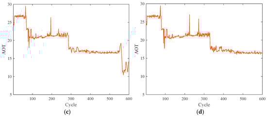 Variation of AOT in lithium-ion batteries for (a) Battery 1, (b) Battery 2, (c) Battery 3, and (d) Battery 4.