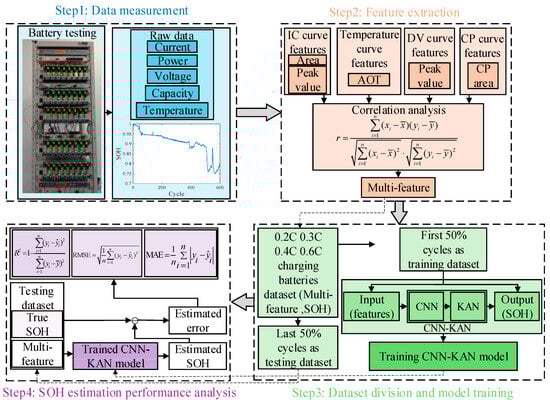 In this paper, a new framework for estimating the SOH of lithium-ion batteries is proposed. Firstly, in terms of feature extraction, the charging capacity–power (CP) curve is analyzed to extract the CP features, and these features are integrated with the average operating temperature (AOT) features of the battery to form multi-dimensional features. Subsequently, a highly accurate SOH estimation model is constructed using the CNN-KAN model.