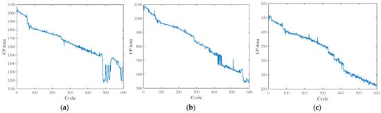 In this paper, the CP area is used as the key characteristic parameter. Figure 15 shows the variation trends of the CP area across the cycles of the other three batteries, excluding the sample shown in Figure 2.