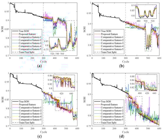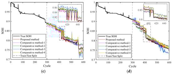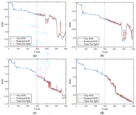 The lithium-ion battery SOH estimation for (a) Battery 1, (b) Battery 2, (c) Battery 3, and (d) Battery 4.