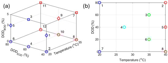 For the cycle aging DoE, three factors were selected as part of the design: the temperature, the DOD at BOD, and the DOD at EOD. Since only two temperature chambers were available, two levels were considered for the experiments, 20 °C and 35 °C. Three levels were considered for the DODBOD (a proxy to the charge cut-off voltage), 0%, 3%, and 5%, and the DODEOD, 40%, 60%, and 80%. Based on this information, an optimal custom design was calculated using the Design Expert 13 software (Stat-Ease, Minneapolis, MN, USA) using an I-optimality to maximize prediction capability. More details on different DoEs and optimalities can be found in []. The calculated design contains twelve unique experiments, as shown in Figure 1a and Table A1. For the calendar aging DoE, only two factors were considered, the temperature and the DOD, as shown in Figure 1b and Table A2. The temperatures were chosen to be 20, 27.5, 35, and 40 °C. This temperature range was selected as the most representative of the planned application for the cells. For the same reasons, the DOD range was set to be between 0 and 80%. The resulting optimal custom design, still with an I-optimality, consisted of 8 unique experiments, as shown in Figure 1b and Table A2. All DODs were calculated assuming discharges at 1/6th of the nominal power, which is the power level most relevant to the application.