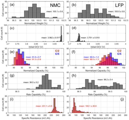 Summary of cell-to-cell variations for the NMC (left column) and LFP (right column) cells with the distribution of (a,b) the normalized weight, (c,d) the initial OCVs, (e,f) the normalized capacities at C/5 and C/2, (g,h) the rate capability, and (i,j) the specific resistance.
