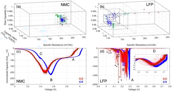 The SOC estimations also allowed the calculation of the capacity ration (QR), in %Qnom/%SOC because of the anonymization of the data, which is our third attribute to characterize cell-to-cell variations [,]. Using this capacity ration, the rate capability, the specific resistance, and the extent of the cell-to-cell variations can be plotted in three dimensions at the same scale for both cells, as shown in Figure 3a and Figure 3b, respectively, for the NMC and LFP cells. Using this representation, it can be observed that the overall cell-to-cell variations were smaller for the NMC cells but that, for both chemistries, most of the cells fell within 2σ around the mean. The biggest outliers were observed for the LFP cells, with four cells having a much higher resistance, which were the same cells with the much higher EOD RCVs.