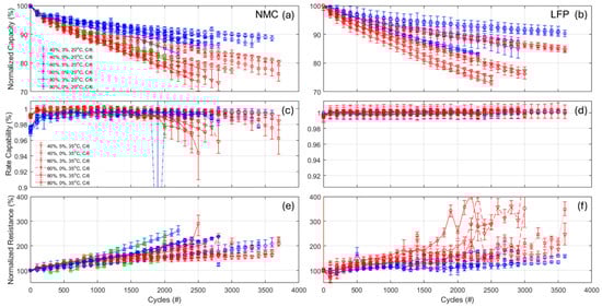 Evolution of (a,b) the capacity, (c,d) the rate capability, and (e,f) the normalized resistance as function of the cycle number for the NMC and LFP cells, respectively. The error bars indicate minimum and maximum values within the replicates.