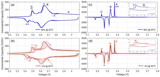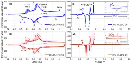 Figure 5 presents the evolution of the IC signature for the cells with the least (top row) and most (bottom row) capacity loss for the NMC (left column) and LFP (right column) cells. For ease of visualization, peak movement was represented by colored arrows. For the NMC cells, it can be seen that, in the case of the least capacity loss, Figure 5a, the local minima in charge around 3.75 V between A and B moved towards higher voltages, the main peak B shrank from the lower voltages in charge and higher voltages in discharge, and the low voltage peak C broadened in discharge and moved towards higher voltages in charge. For the cells with the most capacity loss, Figure 5b, the evolution of the local minima is similar but peak B almost disappeared while moving towards higher voltages in charge, whereas peak C broadened in both charge and discharge while moving towards higher voltages. The IC evolution for all the other experiments sits in between and is provided in Figure A5 for C/25 and Figure A6 for C/6.