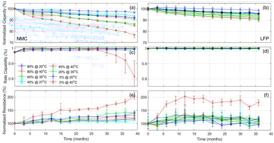 Evolution of (a,b) the capacity, (c,d) the rate capability, and (e,f) the normalized resistance as function of the calendar aging months for the NMC and LFP cells, respectively. The error bars indicate minimum and maximum values within the replicates.