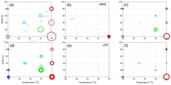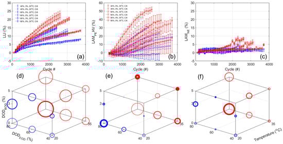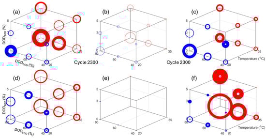 Because of the number of experiments, it is difficult to visualize the impact of the different DoE factors (temperature, DODEOD, and DODBOD) on the different responses in Figure 4. The impact is better visualized by using the 3D representation presented in Figure 1a. Figure 8 presents the impact of the design factors on (a, d) the capacity loss, (b, e) the rate capability deviation from 100%, and (c, f) the normalized resistance increased for cycle 2300, which is the highest common cycle between all the experiments for the NMC and LFP cells, respectively. In Figure 8, the circle size is proportional to the changes and the line width is proportional to the deviation within the replicates. The scale was also kept consistent between chemistries. Looking at the capacity loss, Figure 8a,d, there is a clear direct impact of temperature, a direct impact of the DODEOD, and the smallest impact seemed to be DODBOD, which is inverted (more loss for lower DODsBOD). All impacts seemed slightly larger for the NMC cells, but overall they seem close. For the rate capabilities, Figure 8b,e, there was no change for the LFP cells, but for the NMC ones, the impacts seemed similar to the one observed on capacity losses. For the normalized resistances, Figure 8c,f, the impact order also seemed to be the same, but this time temperature affected the LFP cells much more than the NMC ones.
