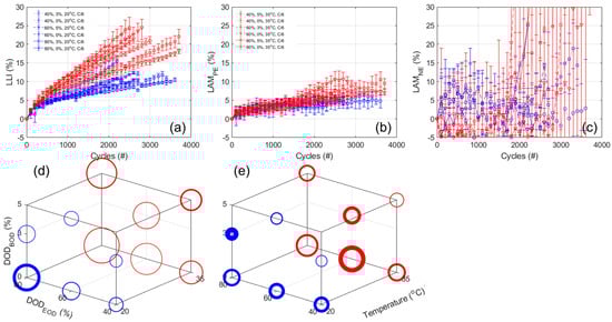 Figure 10a,b,c presents the evolution of the estimated LLI, LAMPE, and LAMNE, respectively, with Figure 10d,e displaying the 3D representation of the results after 2300 cycles for the LLI and LAMPE. The results for the ANOVA analysis are provided in Table A7. For the LLI, and unsurprisingly, the results are similar to the one observed for the capacity loss, with a bigger impact for temperature (3.52 from the ANOVA analysis), then the DODEOD (2.87), and finally a lower inverse impact for the DODBOD (−1.45). For the LAMPE, there seems to be mostly an impact of temperature, which is confirmed by the ANOVA analysis (1.55, 0.47, and −0.64, respectively, for temperature, DODEOD, and DODBOD). From the LAMNE, the automatic quantification is unfortunately very noisy, Figure 10c, and the variations between replicates cover the same range as the evolution with cycle. However, a closer look at the variations cell by cell, Figure A14a allowed the estimation that no significant LAMNE was occurring for all but three cells, the one tested up to 60% and 80% DOD from 0% at 20 °C and the one tested up to 60% DOD from 0% at 35 °C, that likely experienced around 5% LAMNE only starting to occur from the latest 600 cycles; however, a more precise quantification is not possible without significant modeling which was out of the scope of this work.
