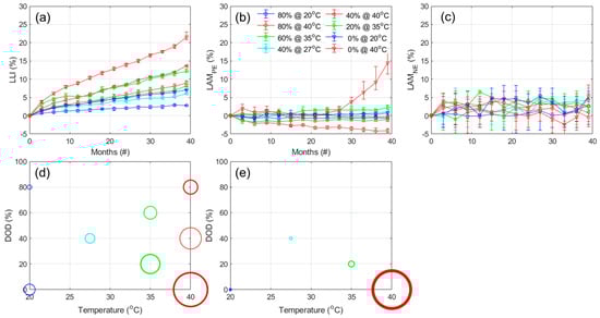 Evolution of the (a) LLI, (b) LAMPE, and (c) LAMNE as a function of months of calendar aging for the calendar aging experiment for the NMC cells. Associated (d) LLI and (e) LAMPE versus design parameters after 36 months of aging. The circle size is proportional to the increase and the line width indicates deviation between the five tested cells. Scale is common with the cycle aging DoE. The error bars indicate minimum and maximum values within the replicates.