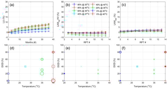 Evolution of the (a) LLI, (b) LAMPE for the high voltage phase, and (c) LAMNE as a function of months of calendar aging for the calendar aging experiment for the LFP cells. Associated (d) LLI and, (e) LAMPEHV decrease, and (f) LAMNE increase versus design parameters after 36 months of aging. The circle size is proportional to the increase and the line width indicates deviation between the five tested cells. The scale is common with the cycle aging DoE. The error bars indicate minimum and maximum values within the replicates.