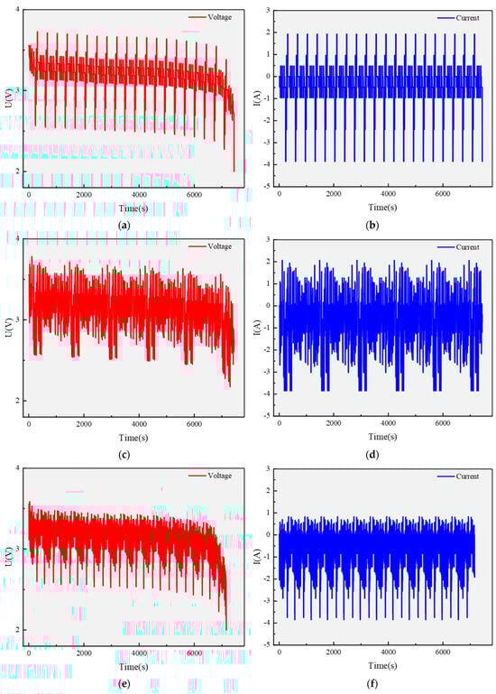 (a) Voltage profile of the DST driving cycle; (b) Current profile of the DST driving cycle; (c) Voltage profile of the FUDS driving cycle; (d) Current profile of the FUDS driving cycle; (e) Voltage profile of the US06 driving cycle; (f) Current profile of the US06 driving cycle.