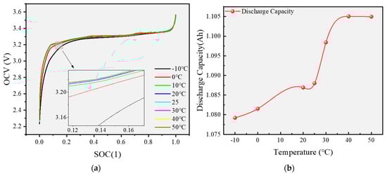 (a) OCV-SOC characteristics at various temperatures; (b) Discharge capacity as a function of temperature.