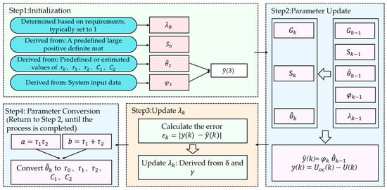 Finally, parameter identification was conducted using data from the DST driving cycle. An adaptive dynamic genetic factor recursive least squares (RLS) method [29,30] was employed for online system parameter identification. The key steps include initialization, predicted output calculation, parameter updating, dynamic genetic factor updating, and parameter transformation, as illustrated in the flowchart in Figure 4.