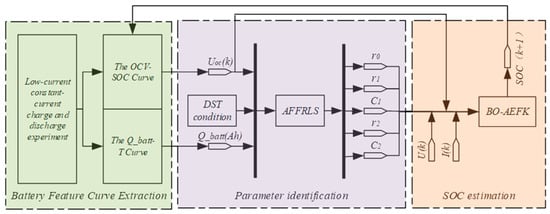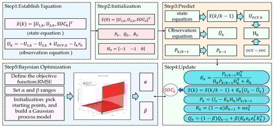 To improve the accuracy and robustness of SOC estimation for lithium-ion batteries, this study proposes a novel BO-AEKF algorithm, which integrates Bayesian optimization with the AEKF [31]. Furthermore, to address model errors induced by environmental temperature variations, dynamic updates are applied to key parameters such as the open-circuit voltage and discharge capacity , thereby enhancing the model’s precision and adaptability. The overall estimation framework, incorporating constant current charge–discharge experiments and parameter identification, is illustrated in Figure 5.