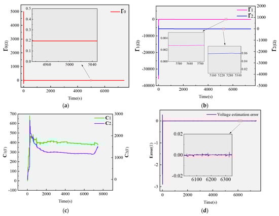 Parameter Identification Curves at 25 °C: (a) ; (b) and ; (c) and ; (d) voltage estimation error.
