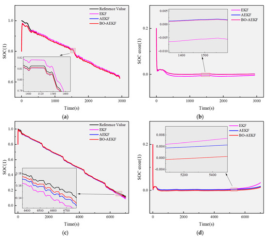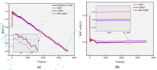 In the initial phase, estimation results exhibited fluctuations due to the uncertainty of the initial SOC value. Notably, the amplitude of these fluctuations increased proportionally with the deviation between the initial state and the true value. However, as the algorithm iterated, these fluctuations gradually diminished and stabilized, highlighting the robust nature of the BO-AEKF algorithm in mitigating the impact of initial errors.