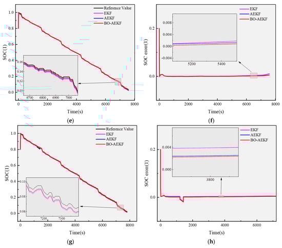 Comparison of Algorithms under Different Temperatures in US06 Operating Condition: (a) SOC Estimation Results at −10 °C; (b) SOC Estimation Error Results at −10 °C; (c) SOC Estimation Results at 0 °C; (d) SOC Estimation Error Results at 0 °C; (e) SOC Estimation Results at 25 °C; (f) SOC Estimation Error Results at 25 °C; (g) SOC Estimation Results at 50 °C; (h) SOC Estimation Error Results at 50 °C.