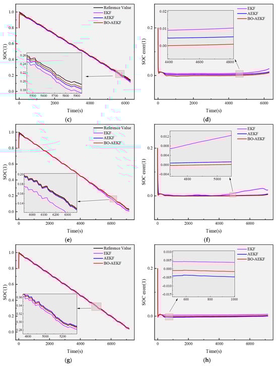 Comparison of Algorithms under Different Temperatures in FUDS Operating Condition: (a) SOC Estimation Results at −10 °C; (b) SOC Estimation Error Results at −10 °C; (c) SOC Estimation Results at 0 °C; (d) SOC Estimation Error Results at 0 °C; (e) SOC Estimation Results at 25 °C; (f) SOC Estimation Error Results at 25 °C; (g) SOC Estimation Results at 50 °C; (h) SOC Estimation Error Results at 50 °C.