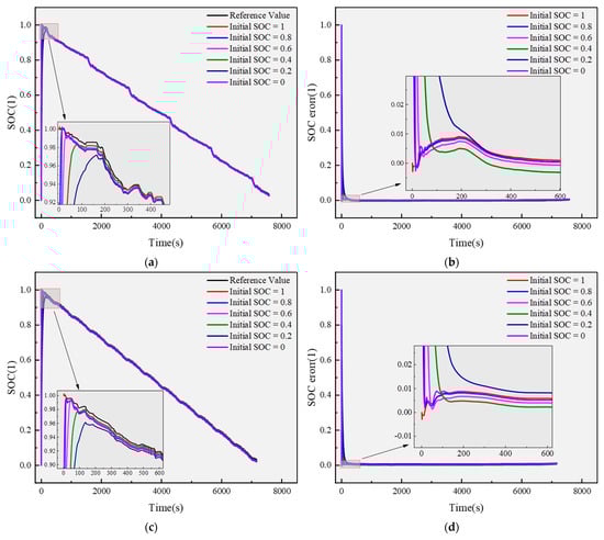 SOC Estimation Under Different Initial Conditions at 25 °C: (a) SOC Estimation Curves Under FUDS Conditions; (b) SOC error Estimation Under FUDS Conditions; (c) SOC Estimation Curves Under US06 Conditions; (d) SOC error Estimation Curves Under US06 Conditions.