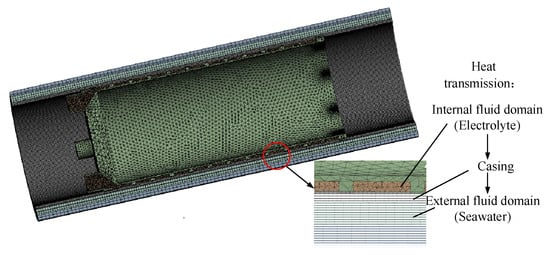 The cooling structure simulation model incorporates three domains: internal electrolyte fluid, solid battery casing, and external seawater. The AgO-Al battery was first 3D-modeled in SolidWorks(v2023), and the parametric geometry was imported into Ansys Fluent. Fluid domains—including electrolyte channels and external cooling regions—were extracted via Boolean operations. A polyhedral mesh was applied for discretization, with domain boundaries and flow paths visualized in Figure 4.