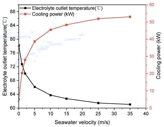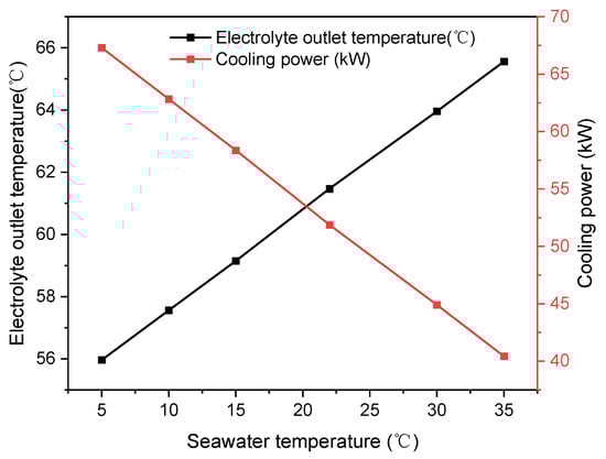 The relationship between seawater temperature and cell heat dissipation power is depicted in Figure 11. With the seawater flow rate, electrolyte inlet temperature, and electrolyte flow rate held constant, variations in seawater temperature exhibit a pronounced effect on both the electrolyte outlet temperature and heat dissipation power. As the seawater temperature increases from 5.0 °C to 35.0 °C, the electrolyte outlet temperature rises from 55.96 °C to 65.56 °C, and the heat dissipation power decreases from 67.31 kW to 40.43 kW, respectively. This behavior is governed by multiple interdependent factors in the heat transfer process, including fluid thermophysical properties, flow regime, and geometric parameters of the cooling structure. An increase in seawater temperature directly reduces the temperature gradient between the electrolyte and seawater, subsequently decreasing convective heat exchange efficiency. This efficiency decline limits the amount of heat transferred from the electrolyte to the cooling medium within the heat exchanger, leading to a rise in electrolyte outlet temperature and a corresponding decrease in heat dissipation power. Quantitatively, each 5.0 °C increment in seawater temperature results in an average 1.6 °C increase in electrolyte outlet temperature and a 4.48 kW reduction in heat dissipation power. These findings highlight the critical role of seawater temperature in thermal management systems: higher seawater temperatures diminish the driving force for heat transfer, compromising the cooling structure’s ability to maintain optimal electrolyte temperatures. Maintaining lower seawater temperatures within operational constraints is therefore essential for maximizing heat dissipation efficiency and ensuring stable system performance.