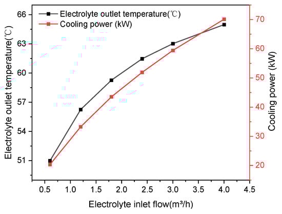 The relationship among the electrolyte flow rate, electrolyte outlet temperature, and heat dissipation power is depicted in Figure 12. When the seawater flow velocity is kept constant at 25.0 m/s, as the electrolyte flow rate increases from 0.6 m3/h to 4.0 m3/h, both the electrolyte outlet temperature and heat dissipation power exhibit an increasing trend following a logarithmic curve. Specifically, the electrolyte outlet temperature rises from 50.98 °C to 64.98 °C, and the heat dissipation power increases from 20.31 kW to 70.09 kW.