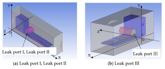 Three leakage ports with different leakage positions and leakage directions are opened at the hydrogen supply pipeline valve box, namely leakage port I, leakage port II, and leakage port III, as shown in Figure 2. Among them, leakage port I and leakage port II are arranged in the middle part of the hydrogen supply pipeline, and the leakage direction flows to the front and rear of the vehicle, respectively. Leakage port III is arranged at a position below the Z axis of the hydrogen storage bottle, and the leakage direction is vertically upward. The selection parameters of these three leak ports are shown in Table 1.