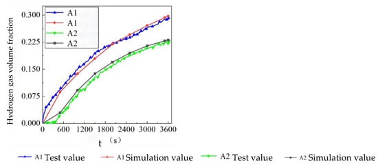 The hydrogen leakage diffusion test data of Pitts et al. [16] was selected for verification, and the highest monitoring point and the lowest monitoring point in the test were used for hydrogen monitoring concentrations. The two monitoring points were recorded as A1 and A2, respectively. The simulation results were compared and analyzed with the experimental data of the two monitoring points, as shown in Figure 3. It can be seen that the simulation results are the same as the experimental data trend, with a maximum error of 8.2%, minimum error of 3.1%, and average error of 4.9%. All errors are within an acceptable range. This simulation method can be used for a concentration simulation analysis of the hydrogen leakage process.