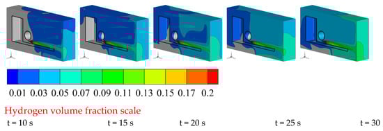 Figure 4 shows the diffusion process of hydrogen after leakage from leakage port I under a completely closed environment. When hydrogen leaks, it first diffuses to the rear wall surface, blocks it, and then spreads around it. When the hydrogen leakage time is t = 10 s, hydrogen is distributed on the space wall and the ground. As hydrogen continues to leak, when the hydrogen leakage time is t = 15 s, the upper hydrogen diffuses along the upper wall and the lower hydrogen along the ground at the same time to the front of the vehicle. When the hydrogen leakage time is t = 20 s, the hydrogen below the vehicle chassis no longer spreads to the front of the vehicle but continues to gather under the chassis. At this time, the hydrogen diffused above is also divided into two channels. The inner hydrogen gradually gathers downward during diffusion forward, while the outer hydrogen gathers towards the edge corner and gradually spreads forward along the corner. When the hydrogen leakage time is t = 25 s, hydrogen completely covers the middle and rear area of the vehicle, and the hydrogen volume fraction at this time can reach 0.04~0.06.