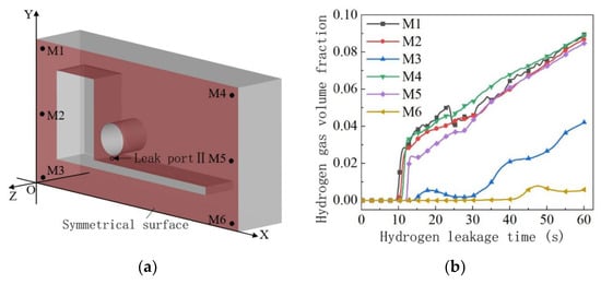 In the leakage situation of hydrogen from leakage port II, monitoring points M1–M6 are set on the Z = 0 m plane. The spatial coordinates of the M1–M6 monitoring points are shown in Table 2; the monitoring points are shown in Figure 5, where Figure (a) represents the specific location of the monitoring points, and Figure (b) represents the changes in hydrogen concentration at the M1–M6 monitoring points.