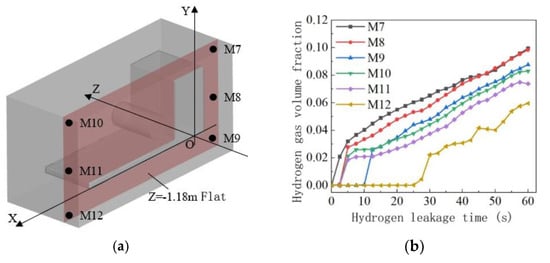 Leakage port III is located on the side of the hydrogen storage bottle, and the Z coordinate value of the leakage center is −1.18 m. The spatial coordinates of monitoring points M7–M12 are shown in Table 3, and the monitoring points positions are shown in Figure 6a. The changes in the hydrogen concentration at the M7–M12 monitoring points are shown in Figure 6b.