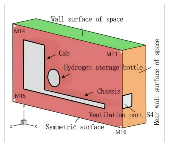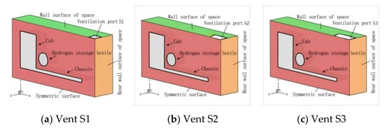 After hydrogen leaks from leakage port I along the X-coordinate axis to the rear of the vehicle, it will first spread to the rear wall of the space. At the heights of the rear wall and the leakage port of the space, a ventilation port S4 is provided, and a ventilation port of equal area S1 (shown in Figure 7) is arranged behind the upper wall of the space to analyze the influence of the position of the ventilation port on the hydrogen concentration in the closed space. The structure and situation of the vents are shown in Figure 9 and Table 6, respectively.