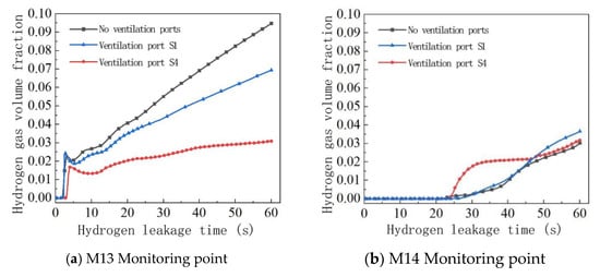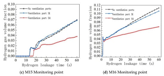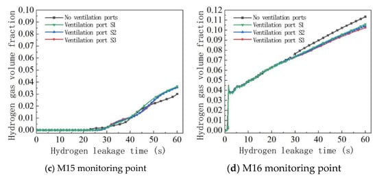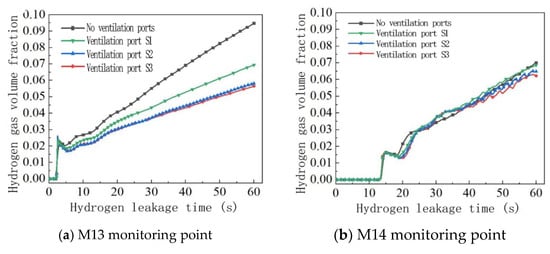 In order to analyze the changes in spatial hydrogen concentration over time at different ventilation opening positions, the changes in hydrogen concentration at the M13-M16 monitoring point were analyzed. The changes in hydrogen concentration at each monitoring point at different ventilation opening positions are shown in Figure 10, and the hydrogen volume fraction at the monitoring point at 60 s is shown in Table 7.