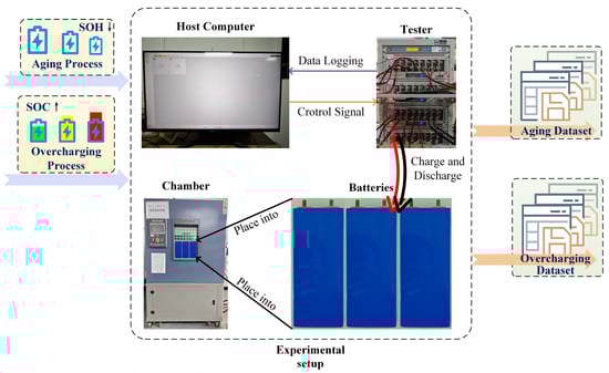 The experimental workflow of this study is illustrated in Figure 1, comprising two main parts: aging data acquisition and fault data collection. The fault data represent both overcharge and overdischarge conditions. All experiments were conducted using a custom-built battery testing platform previously developed and validated by the research team. Details of this platform and the associated dataset were reported in our earlier publications [,].