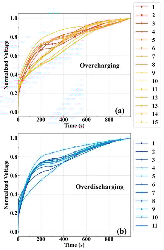 Voltage curves of the charging process: (a) overcharge; (b) overdischarge.