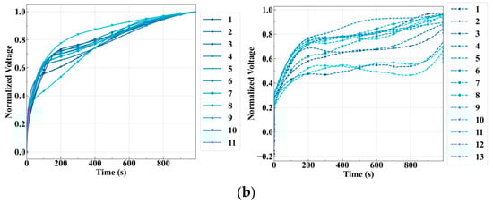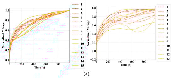 Based on the training protocol detailed in Section 3, this subsection evaluates the fundamental generative fidelity and computational efficiency of diffusion models for fault data augmentation. Visual inspections of the generated samples across the training epochs illustrate the convergence and qualitative resemblance to real fault patterns. These visual results, depicted in Figure 5, confirm that the synthetic voltage profiles generated by the conditional diffusion model accurately capture real charge dynamics, such as rapid voltage rise, mid-range nonlinearity, and saturation behavior, even with limited training data.