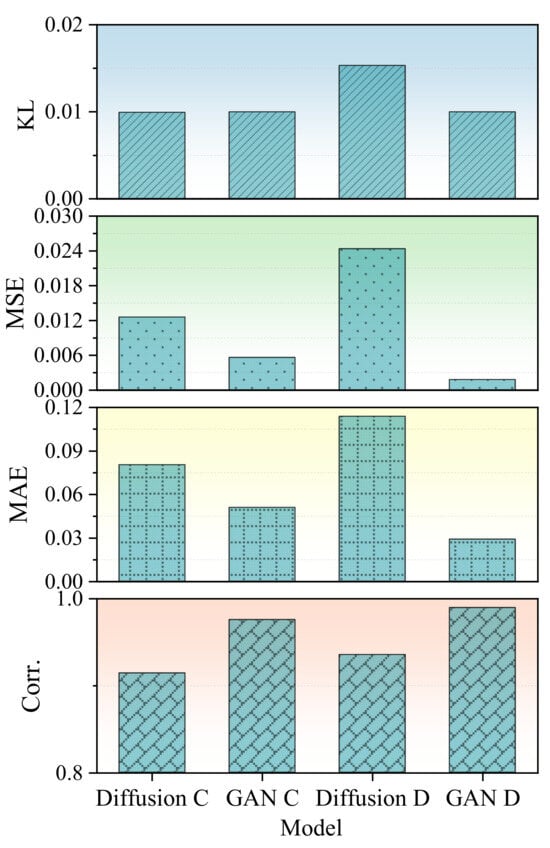 Generative fidelity is quantitatively evaluated using KL divergence, MSE, MAE, and PCC, as summarized graphically in Figure 6. Under the mild overcharge condition (label “C”), the diffusion model yielded a KL divergence of 0.00995, an MSE of 0.01257, an MAE of 0.08035, and a PCC of 0.91425. Although the GAN achieved slightly better metrics in this scenario—such as an MAE of 0.05088 and a PCC of 0.97553—the performance differences remained minor. Similarly, under mild overdischarge conditions (label “D”), the diffusion model achieved a KL divergence of 0.01533 and a PCC of 0.93535, again closely approaching GAN performance (PCC 0.98937), despite operating under data-scarce conditions and fewer training epochs.