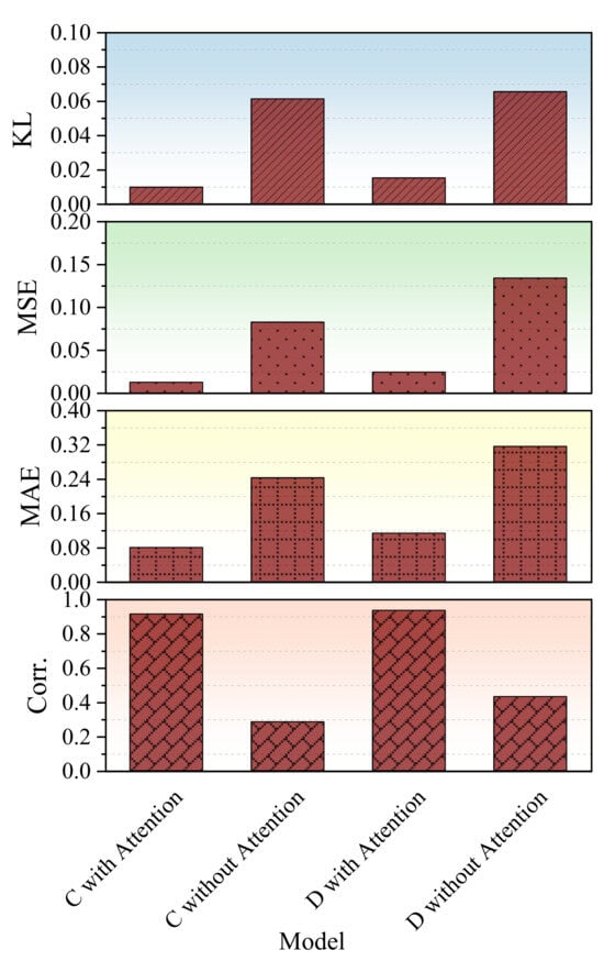 Effect of attention mechanisms on generative performance. Comparison of diffusion models with and without attention under overcharge (C) and overdischarge (D) conditions. Models with attention show lower error metrics (KL, MSE, MAE) and higher PCC, demonstrating improved fidelity and stability for synthetic fault data generation.