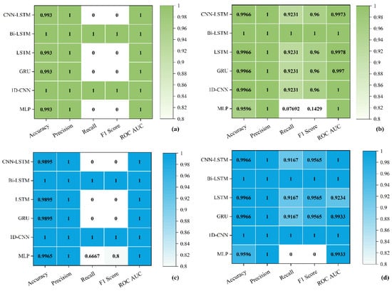 Results for the overcharge scenario are summarized first. Figure 9a,b shows the classification performance of the six models before and after augmentation. Prior to augmentation, despite achieving high accuracy (approximately 0.99), most models displayed poor recall and F1 scores, with values close to zero (≤0.05). This indicated significant difficulties in correctly identifying fault instances due to limited training data. After augmentation, substantial improvements were observed across all models. For instance, CNN–LSTM, GRU, and LSTM exhibited consistent increases in recall and F1 scores, reaching values around 0.92 (recall) and 0.96 (F1-score). Models such as Bi-LSTM and 1D-CNN achieved perfect performance across all metrics, including an ROC–AUC of 1.0.