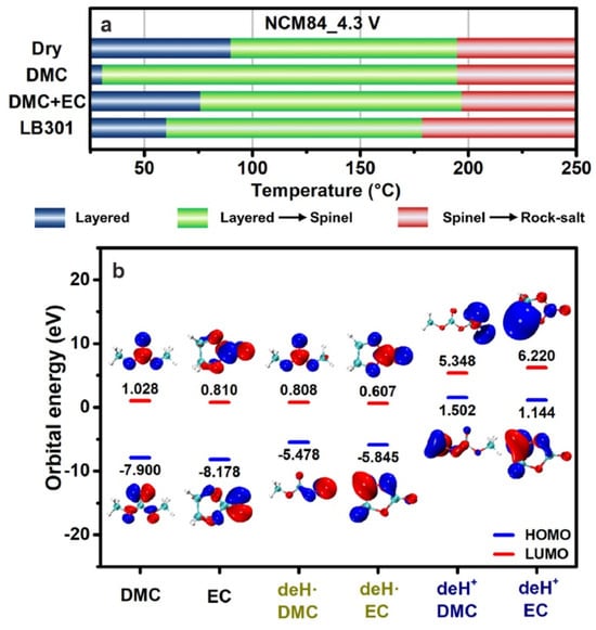 Temperature regions of different thermal decomposition stages of NCM84_4.3 V samples in different electrolyte components (a). Molecular orbital energy levels of carbonate molecules and their dehydrogenation products (b). Schematic diagram of near-surface structural thermal stability modulated by electrolyte components (c). Reproduced from ref. []. Copyright 2022 Elsevier.
